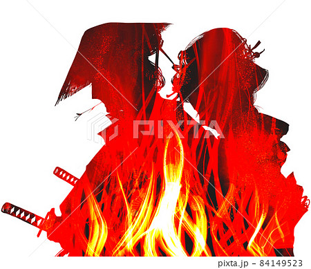 吉原の花魁と武士の間男のメラメラ燃える炎のシルエット切り絵風イラスト
