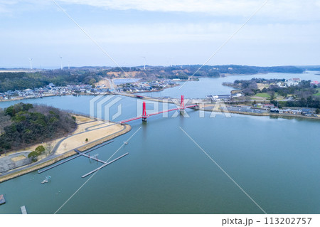 福井県北部の憩いの場所である北潟湖湖畔公園とアイリスブリッジの空撮|福井県あわら市