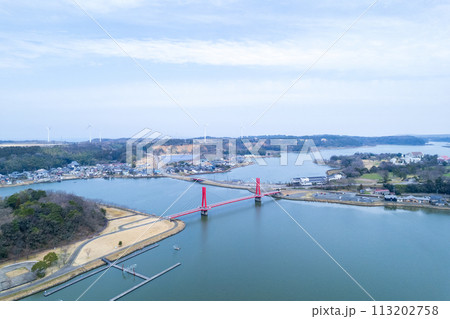 ドローン|パノラマ撮影|北潟湖に架かる赤色に輝くアイリスブリッジの空撮|福井県あわら市