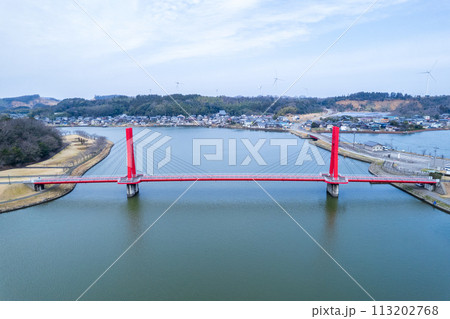 ドローン|北潟湖に架かる赤色に輝くアイリスブリッジの空撮|福井県あわら市