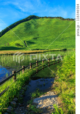 2024年夏曽爾高原の夕景 夕日を受けて美しい山肌を見せる倶留尊山と豊かな水を湛えたお亀池 縦構図