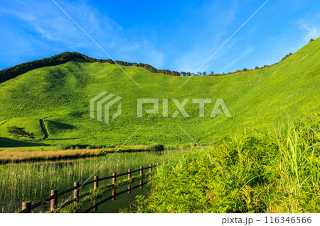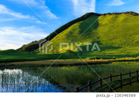 2024年夏曽爾高原の夕景 夕日を受けて美しい山肌を見せる倶留尊山と豊かな水を湛えたお亀池 横構図②
