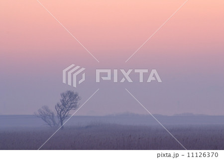 朝焼けする霧の渡良瀬遊水地の葦原に木立