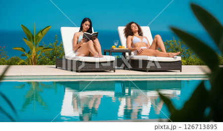 Two Friends Enjoying Perfect Poolside Relaxation Day Reading and Sunbathing Together