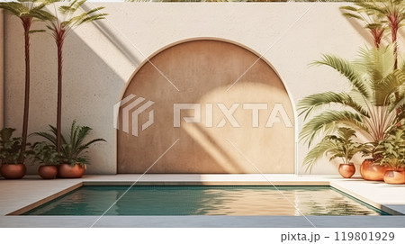 Luxurious resort exterior with a refreshing pool, and the shadow of palm leaves.