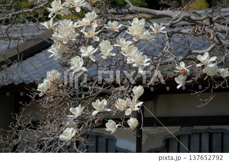 ハクモクレンが咲く遊行寺放生池に立つ観音像の後ろ姿