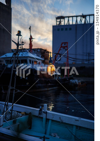 夕日に輝く漁船の誘魚灯