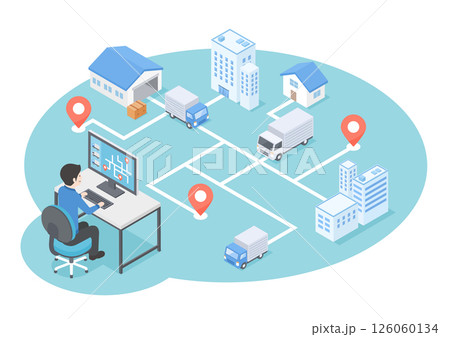 物流の配送状況をモニターで管理している様子をイメージしたアイソメトリックイラスト