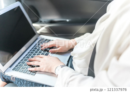自動車の後部座席でノートパソコンで仕事をするビジネスウーマン(Web会議・オンライン会議・出張)