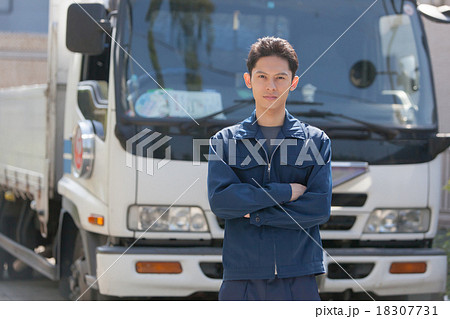 トラックの横に立つ男性作業員のポートレート