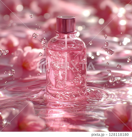 Cosmetics bottle showcasing vibrant pink liquid surrounded by soft petals, perfect for enhancing face care and skin care routines, evoking feelings of freshness and beauty