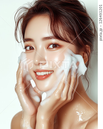 Korean woman applying cleansing foam to her face showcasing radiant skin and a joyful smile in a bright setting