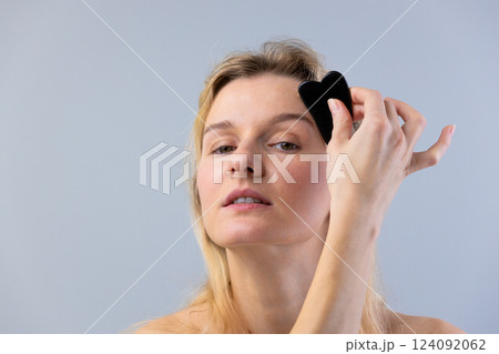 A Close-Up of a Woman Using a Gua Sha Tool for Facial Massage, Enhancing Her Skin's Radiance and Relaxation During a Beauty Routine at Home or in a Salon Setting