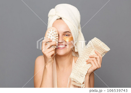 Spa treatment. Body care. Playful smiling young woman wrapped head in towel with patches under eyes covering eye with dry brush having in bathroom posing isolated over gray background.