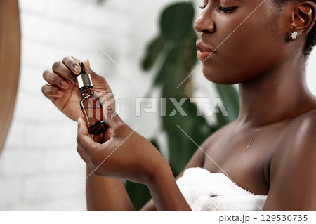 Woman applying facial serum in a serene bathroom setting during a self-care routine