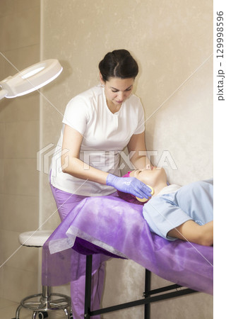 Cosmetologist applying sheet mask on woman's face in beauty salon.