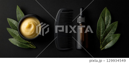 Shea Butter Balm, Oil Dropper, and Comb on Matte Black Background with Leaves