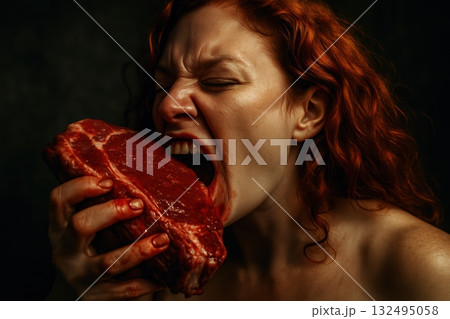 Red-Haired Woman Aggressively Devouring a Bloody Raw Steak in Dark Style
