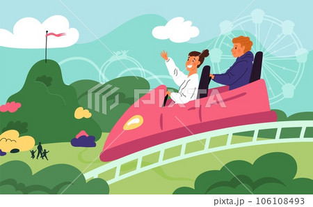 Happy amusement park visitors ride in rollercoaster. Positive emotions. Adrenaline rush. Cartoon people having fun. Couple on roller coaster. Weekend entertainment. Garish vector concept