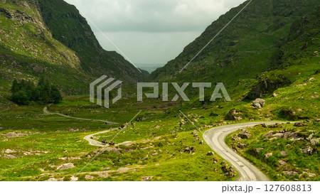 Picturesque mountain pass in Ireland. Road snakes between dramatic peaks; nature's artistry.