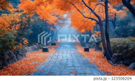 Vibrant autumn leaves covering a serene path in a peaceful forest during foggy weather