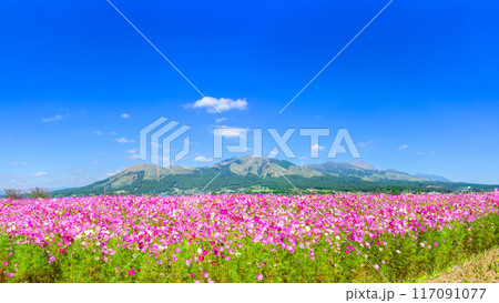 コスモス畑と阿蘇山 熊本県阿蘇郡