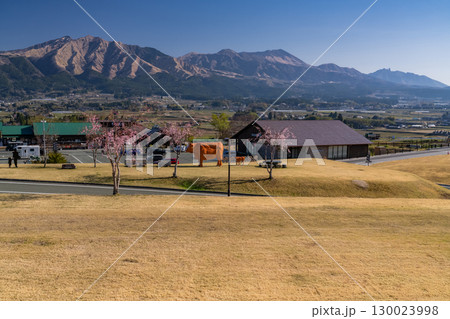 うららかな春空を背景に道の駅 駐車場から観える周辺風景 「道の駅 あそ望の郷くぎの」
