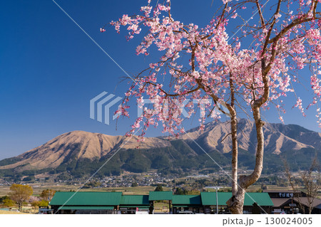 桜の花咲く季節 南阿蘇村から阿蘇の山並み風景 道の駅 あそ望の郷くぎの