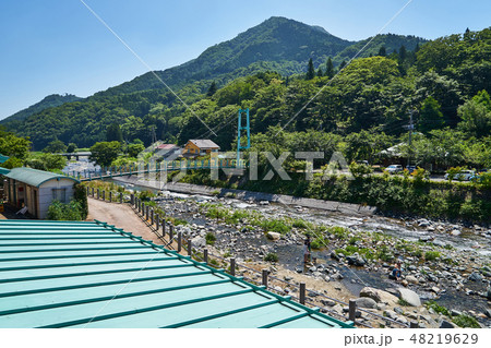 山梨県南都留郡道志村の道の駅どうし周辺の道志川の風景