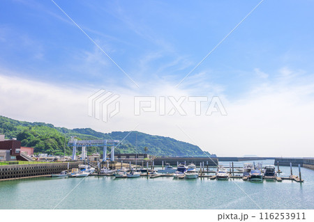 うららかな青空に映える道の駅海岸 船舶 港風景 (宇土市下網田町)「宇土マリーナおこしき館」