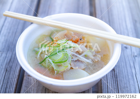 木製の椅子に置かれたどぶろく山菜豚汁