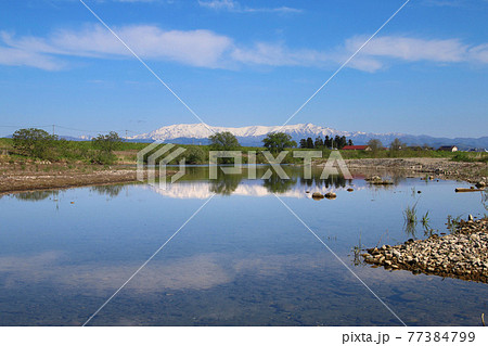 春の飯豊連峰と阿賀川(福島県・会津坂下町)