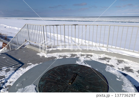 二月、極寒の冬の北海道、サロマ湖、道東、オホーツク海の流氷を望むサロマ湖の龍宮台展望台から望む流氷