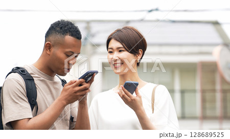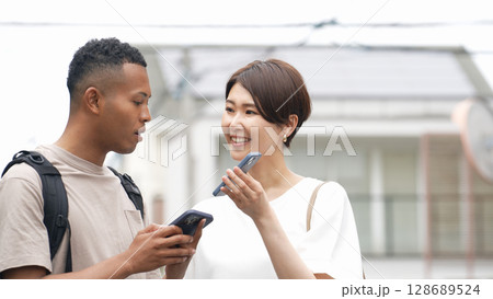 スマホを持って黒人男性に道案内する日本人女性