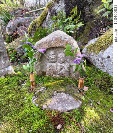 毛呂山町の森林の岩壁に囲まれた獅子ヶ滝の入り口の獅子ヶ滝の石碑と苔むす道祖神の風景