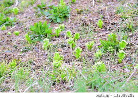 早春の斜面に生えるフキノトウ 早春の里山 東秩父村