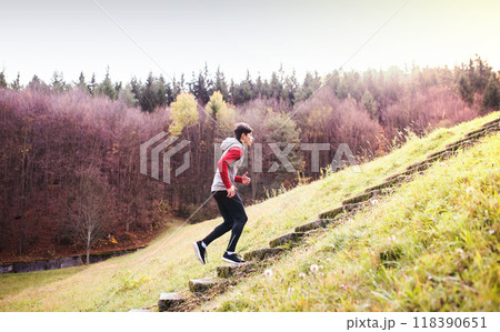 Male runner jogging up the stairs. Side view. Morning running training for young man.