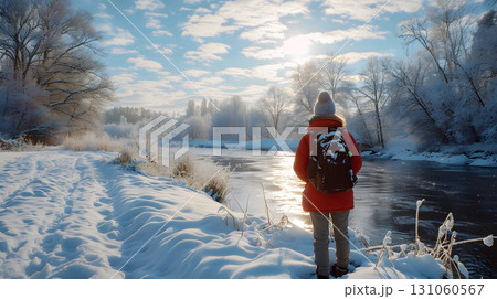 A focused hiker in an orange jacket gazes at the breathtaking mountain landscape, ready for an adventure.