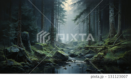 An illustration painting of a mystical forest with a rocky stream flowing through it, shrouded in mist and fog.