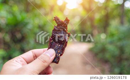 Hand holds piece of beef jerky during hiking break, with blurred nature background and sunlight filtering through trees