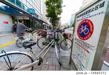 日本の東京都市景観 自転車等放置禁止区域の看板と放置自転車=上野広小路駅前