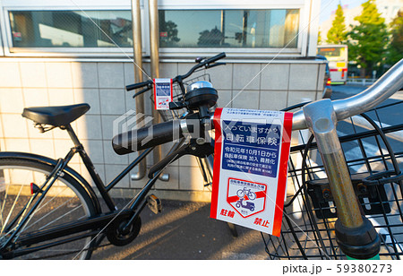 日本の横浜都市景観 日吉駅前・自転車等放置禁止区域の放置自転車に貼られた警告ステッカー=横浜市港北区