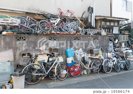日本の東京都市景観 桜新町駅前の放置自転車(奥は駅出入口)