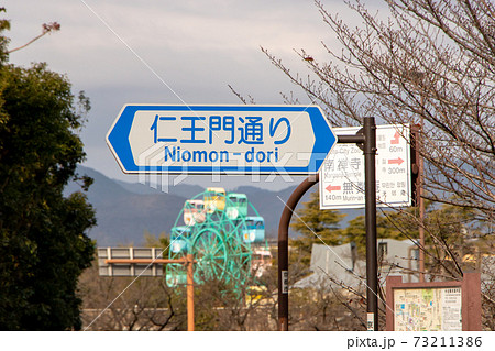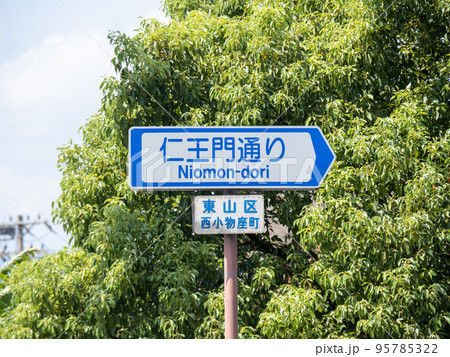 道路標識(案内標識)「道路の通称名」。「仁王門通り」(京都府京都市内)。