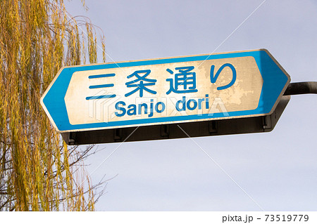 道路標識(案内標識)「道路の通称名」。(京都府京都市「三条通り」)