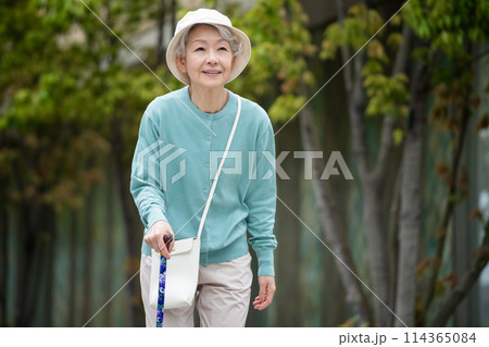 杖をついて歩く白髪のシニア女性