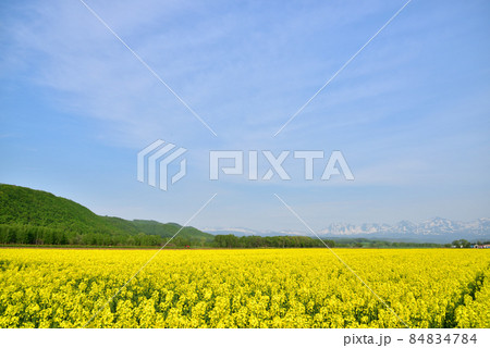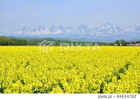 美瑛の春 残雪の十勝連峰 菜の花畑と十勝連峰 北国の春 北国イメージ