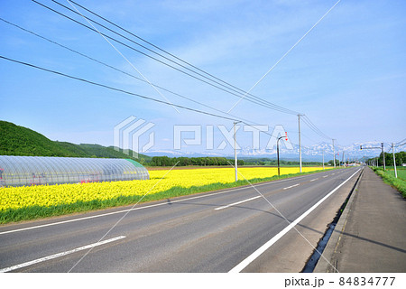 美瑛の春 道道十勝岳温泉美瑛線 残雪の十勝連峰 菜の花畑と十勝連峰 北国の春 北国イメージ