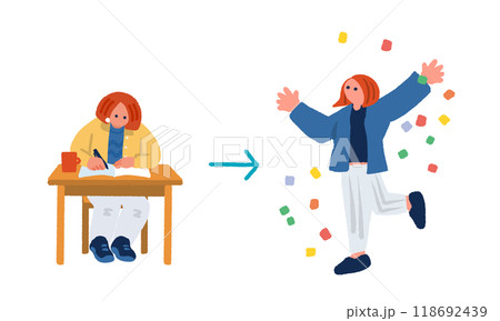 ポジティブな表情でガッツポーズをしながらジャンプする女子学生のイメージイラスト素材