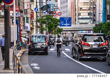 日本の東京都市景観 駐車禁止…横断歩道前で通行妨害どこ吹く風の客待ちタクシー、信号無視自転車=六本木